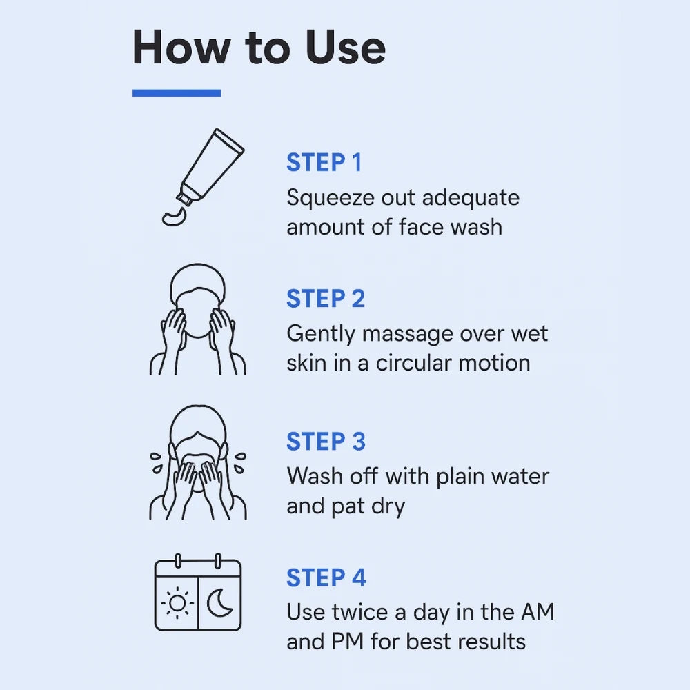 Apply a small amount to damp face. Massage gently in circular motions. Rinse thoroughly. Use twice daily for best results.