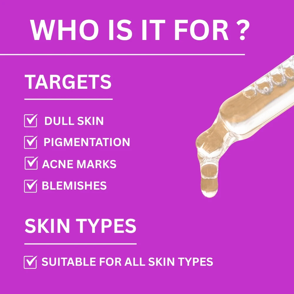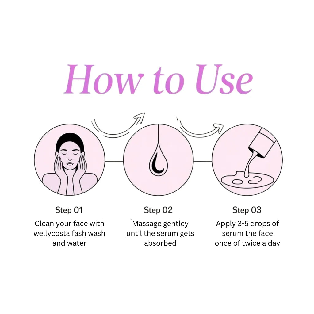 Apply 2–3 drops to clean, dry skin. Gently massage until absorbed. Use morning and night, and follow with moisturizer and sunscreen during the day.