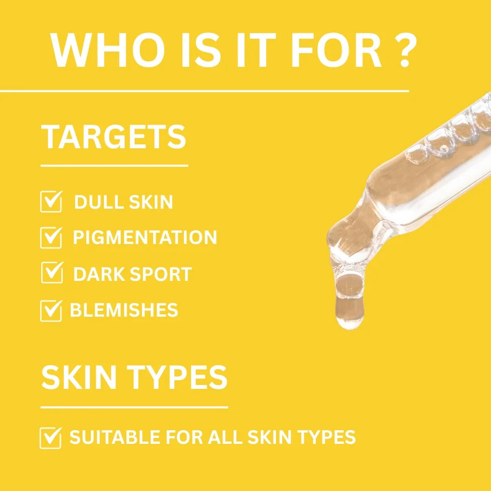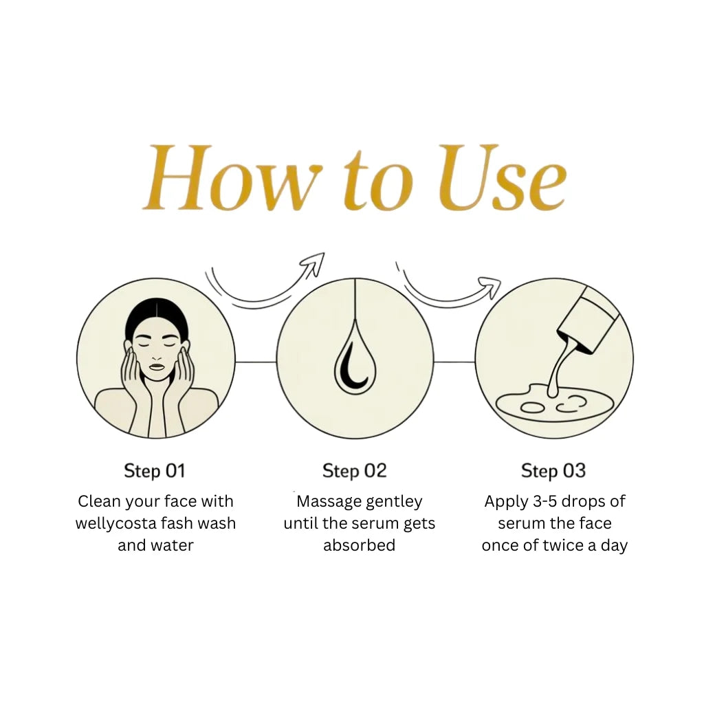 Apply 2–3 drops on clean, dry skin. Gently massage until fully absorbed. Use daily, morning and night. Follow with a moisturizer and SPF during the day.