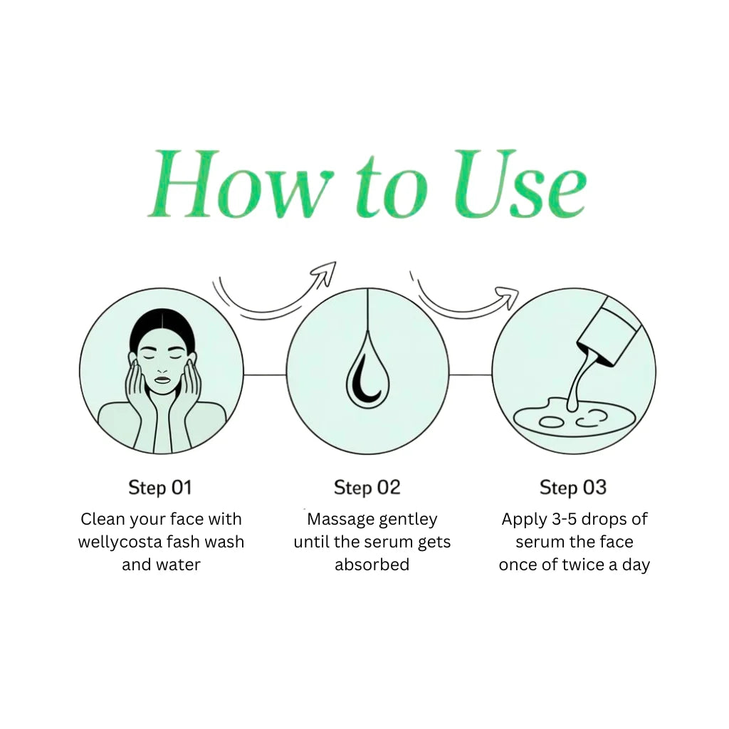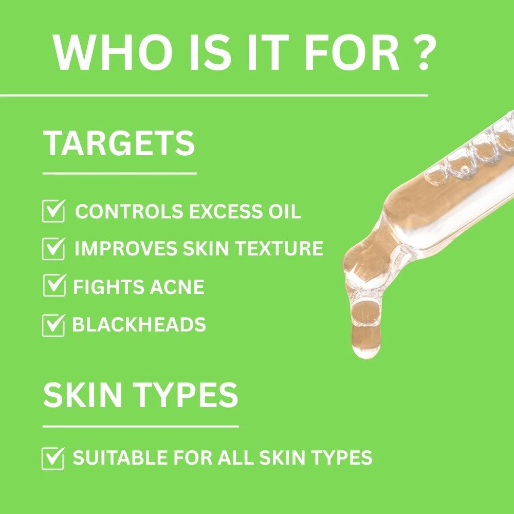 Apply 2–3 drops to a cleansed face at night, focusing on problem areas. Use 2–3 times per week, gradually increasing frequency. Always follow with a moisturizer and apply sunscreen during the day and salicylic acid serum used for all skin type.