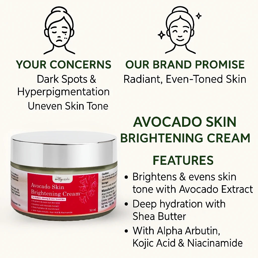Wellycosta Avocado Skin Brightening Cream is a nourishing daily skincare essential that helps you achieve a visibly brighter, even-toned, and glowing complexion. Formulated with Avocado Extract, Alpha Arbutin, Kojic Acid, and Niacinamide, it reduces the appearance of pigmentation, dark spots,aging, and dullness while providing deep hydration.