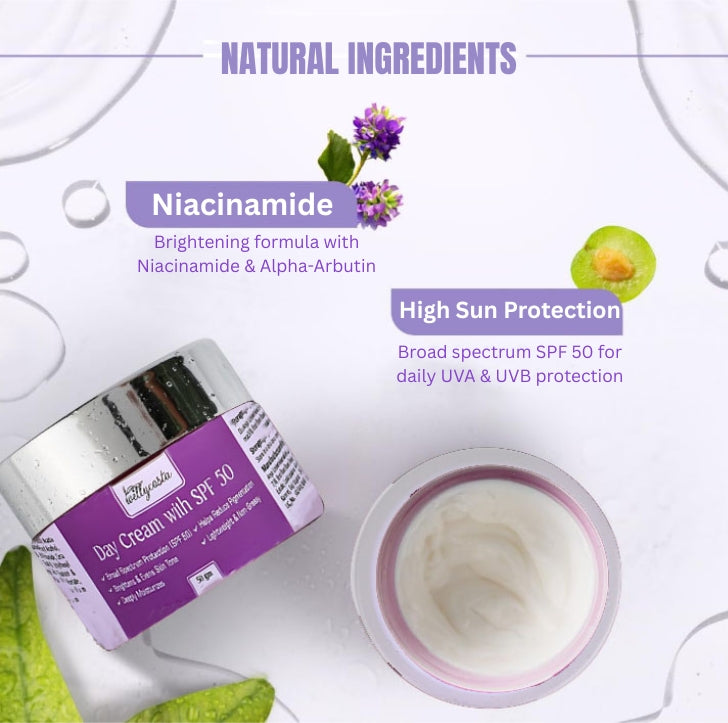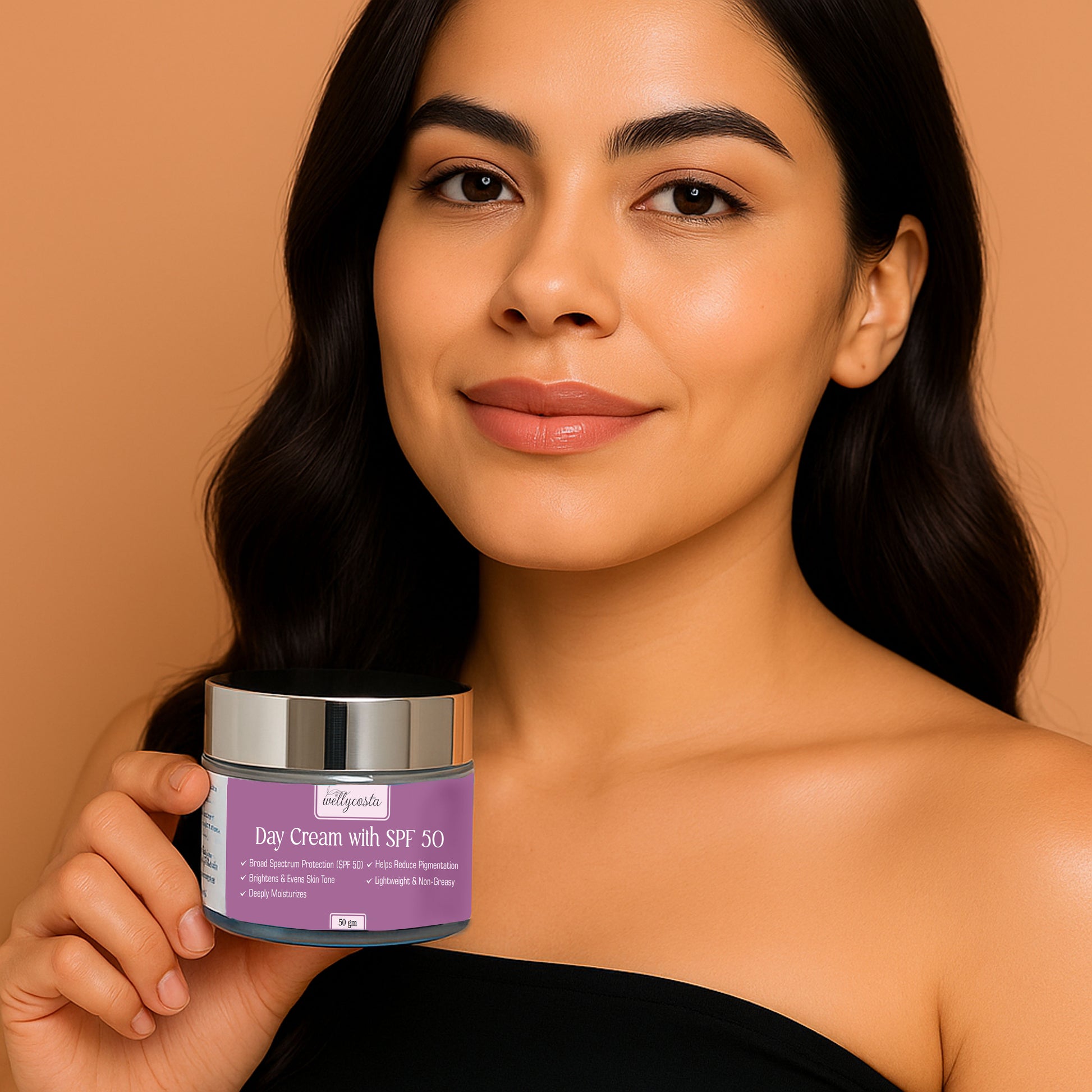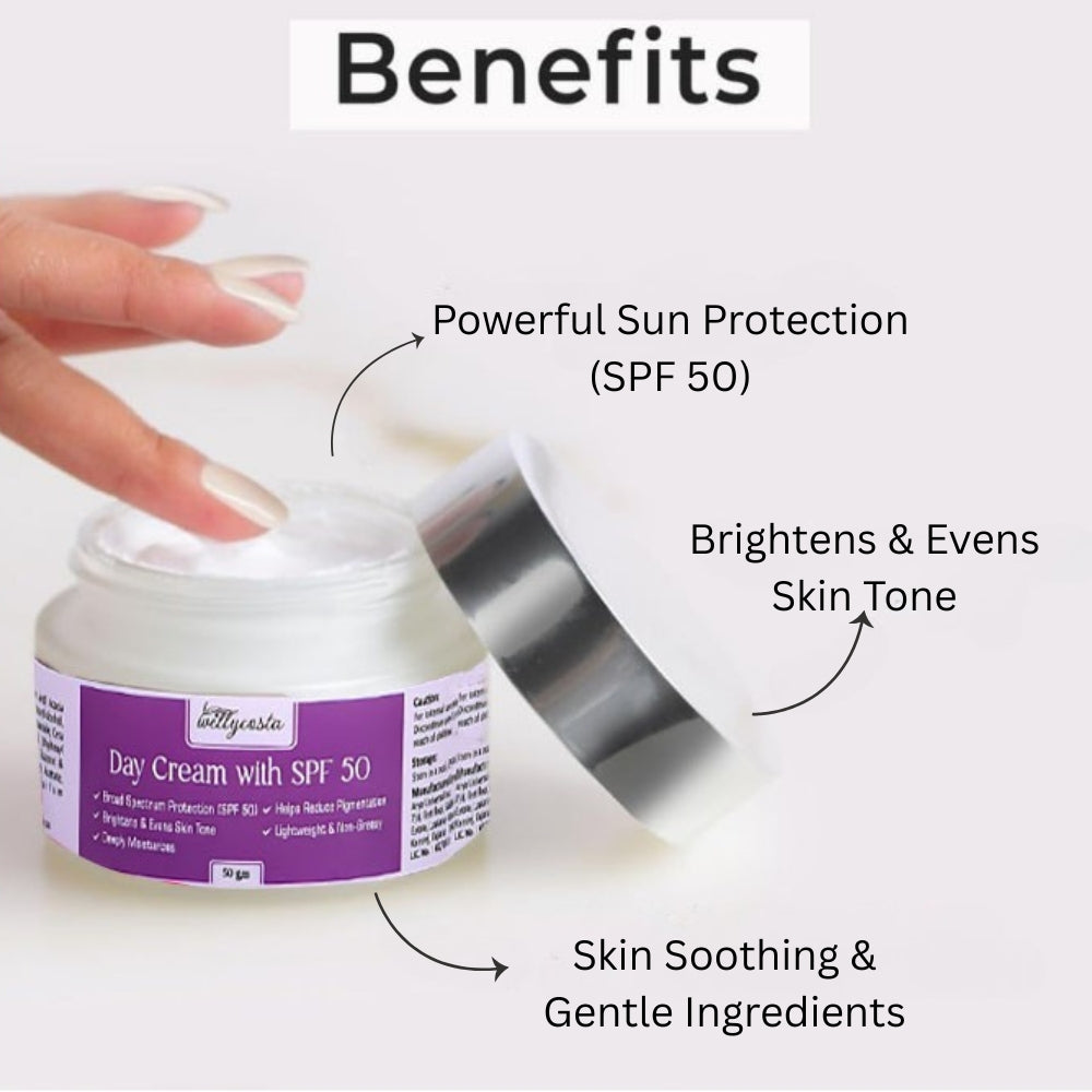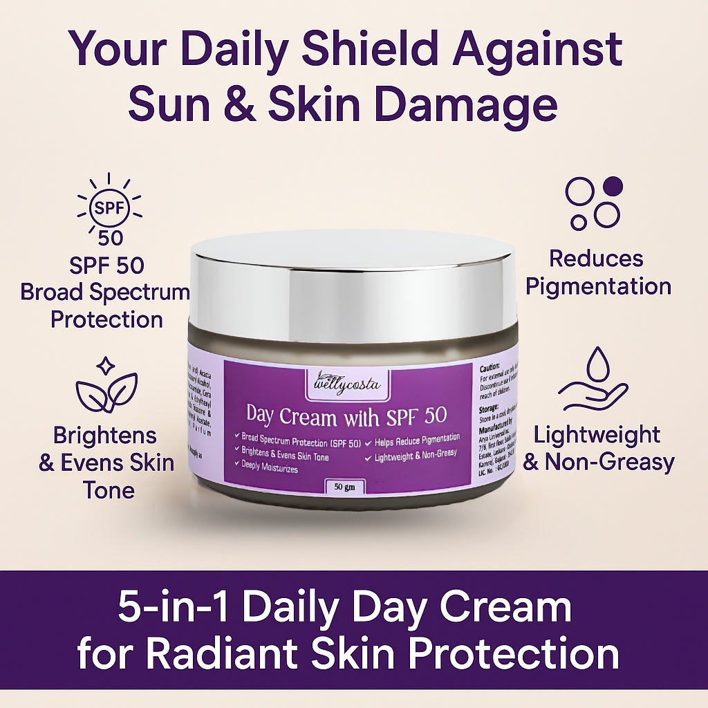 Wellycosta Day Cream with SPF 50 – Brightening, Hydrating & Sun Protection (50g)